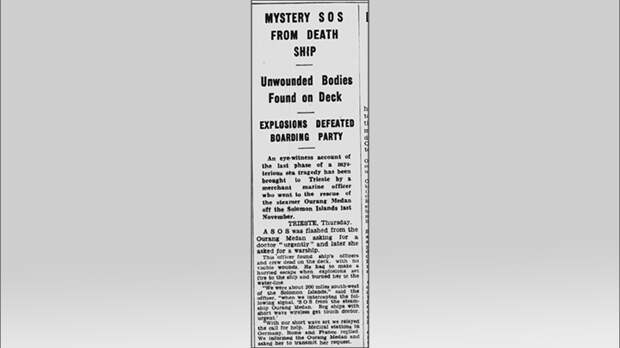 НОВОСТЬ ИЗ БРИТАНСКОЙ ГАЗЕТЫ YORKSHIRE EVENING POST. ТУТ НАПИСАНО, ЧТО КОРАБЛЬ OURANG MEDAN ПОДАЛ СИГНАЛ SOS И СРОЧНО ЗАПРОСИЛ ВРАЧА, А ЗАТЕМ ВОЕННЫЙ КОРАБЛЬ. НА ПАЛУБЕ БЫЛИ ОБНАРУЖЕНЫ МЁРТВЫЕ ТЕЛА ЧЛЕНОВ КОМАНДЫ. ПО ИНФОРМАЦИИ С САЙТА, ДАННАЯ НОВОСТЬ БЫЛА ОПУБЛИКОВАНА 21 НОЯБРЯ 1940 ГОДА. ФОТО: SKITTISHLIBRARY.CO.UK