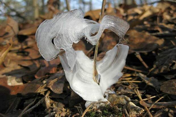 Эти причудливые ледяные цветы состоят из листьев, на которые намерзает лёд. Такие цветы появляются в том случае, если растение ещё не замёрзло и излучает тепло, а температура воздуха вокруг него опустилась до отрицательных значений.
