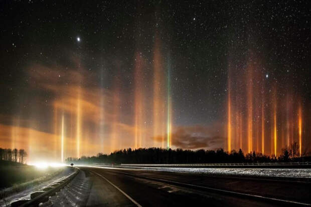 Когда в атмосфере накапливается значительное количество ледяных кристаллов, над большими городами появляются потрясающие световые столбы. Это редкое природное явление возникает только при температуре воздуха ниже 20 градусов Цельсия.