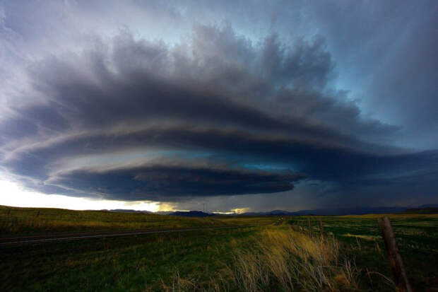 Суперъячейка — это гибрид грозы и мезоциклона. Это явление вращается вокруг своей оси, закручиваясь в спираль.