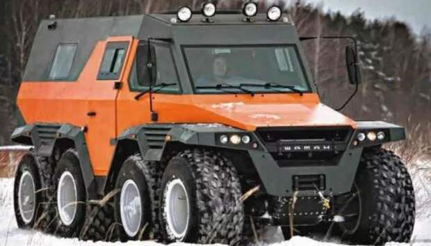 Этот геометрически правильный монстр - Avtoros Shaman 8×8, способен справиться с любым заснеженным бездорожьем. Он имеет мощнейший турбо-дизельный двигатель, 6-ступенчатую коробку передач и три системы рулевого!