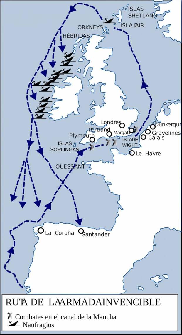 Возможно, это решение было ошибочным: риск продолжения операции был велик, но шансы на успех все-таки имелись. И вряд ли потери в ходе десантной операции были бы выше, чем они стали при бесславном возвращении Великой армады на родину. Устойчивый юго-западный ветер мешал входу в Ла-Манш, и потому 10 августа было принято решение обойти вокруг Британских островов. Англичане следовали за Армадой до 12 августа, после чего вернулись в Дувр. Испанский флот отходил непобежденным. Победу над Великой армадой одержали не храбрые английские моряки, а умелые английские пропагандисты.