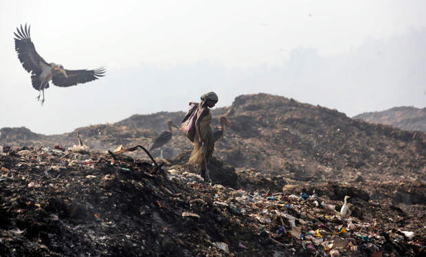 Индийский марабу пролетает возле женщины, которая собирает вторсырьё на свалке на окраине Гувахати, Индия. (Anupam Nath/Associated Press)