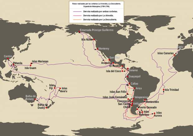 Строго говоря, кругосветная экспедиция при жизни Маласпины была лишь одна – совершенная в 1786-1788 годах, на средства коммерческой Королевской компании Филиппин, в ходе которой он, командуя фрегатом «Астрея», побывал в испанских колониях Южной Америки, посетил Манилу, а затем через Южно-Китайское море и мыс Доброй Надежды вернулся домой. На обратном пути на корабле случилась вспышка цинги, из-за которой погибли 16 членов экипажа, что было воспринято Маласпиной крайне болезненно, и в будущем он станет активным борцом с этой болезнью на флоте. Кроме того, эта кругосветка дала ему ценный опыт, и подняла ряд вопросов, которые требовали отправки новой экспедиции, на сей раз уже куда более серьезной.