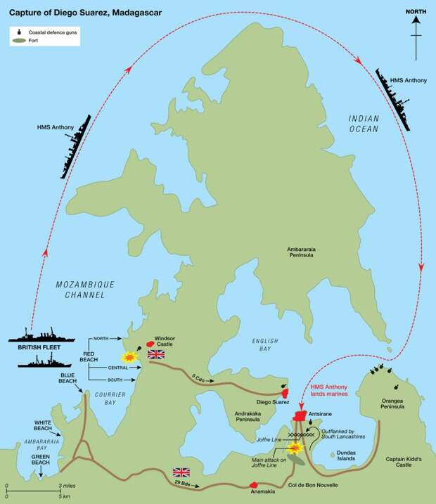 В первый день высадки, 5 мая, британские войска наращивали свой контингент на берегу. Французы окопались возле Диего-Суарес, но ненадолго. Быстрой атакой при поддержке лёгких гаубиц, британцы подавили сопротивление и к вечеру форт был взят. Так север полуострова перешёл под контроль Союзников.