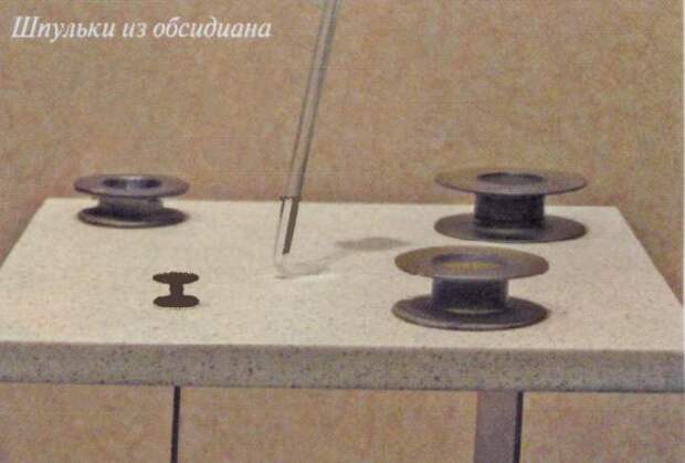 Вся форма шпулек указывает именно на такой способ изготовления. Ведь для получения столь точной круглой формы заготовку нужно вращать. Для обработки твёрдого обсидиана требуются более твёрдые резцы. А для того, чтобы обсидиан при этом срезался, а не скалывался, нужна большая скорость вращения заготовки. Вот и получаем токарный станок!