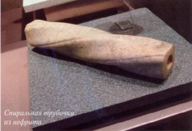 В сравнении со шпульками из обсидиана и горного хрусталя нефритовые изделия могут показаться детскими игрушками. Но и они далеко не все одинаковы, и не все их можно изготовить с помощью самых простых технологий. Например, странной формы трубочка, как будто завёрнутая спиралью вокруг своей оси, гораздо естественнее смотрелась бы, будь она из пластилина или глины.