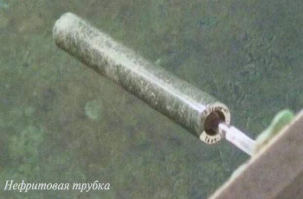 Другая трубочка из нефрита сделана настолько идеально, что кажется выточенной на станке. И это если даже ограничиваться лишь внешней её поверхностью. Но это - трубочка в полном смысле слова: внутри неё просверлено отверстие. Просверлено так, что толщина стенок составляет всего миллиметр-полтора.