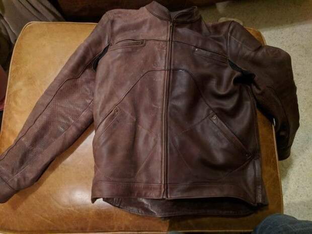 Реставрация кожаной куртки, которая немного истрепалась от езды (слева — до, справа — после)