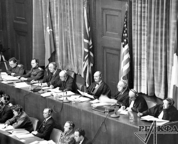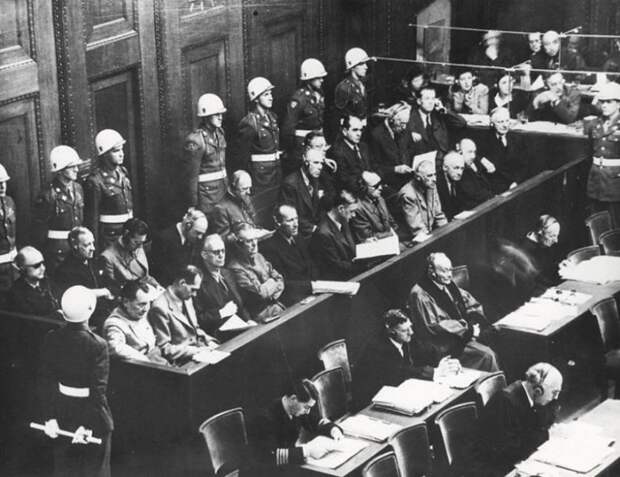Международный Военный Трибунал. На фотографии на скамье подсудимых: 1-й ряд (слева направо): Г. Геринг, Р. Гесс, И. фон Риббентроп, В. Кейтель, Э. Кальтенбруннер, А. Розенберг, Г. Франк, В. Фрик, Ю. Штрейхер, В. Функ, Я. Шахт; 2-й ряд: К. Дениц, Э. Редер, Б. фон Ширах, Ф. Заукель, А. Йодль, Ф. фон Папен, А. Зейсс-Инкварт, А. Шпеер, К. фон Нейрат, Г. Фриче. Фото с сайта