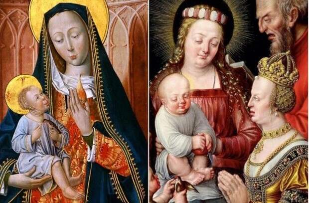 Просмотрев данные картины можно сделать вывод, что художники просто переносили лицо их родителей на младенцев, особенно это заметно в тех картинах, где они изображены вместе. Быть может в этом скрывается тайна их уродливости.
