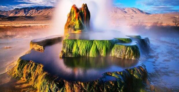 9. Гейзер Флай находится в засушливой пустыне-солончаке Блэк-Рок американского штата Невада, США, на высоте 1230 м над уровнем моря, в тридцати километрах от города Геррлах.