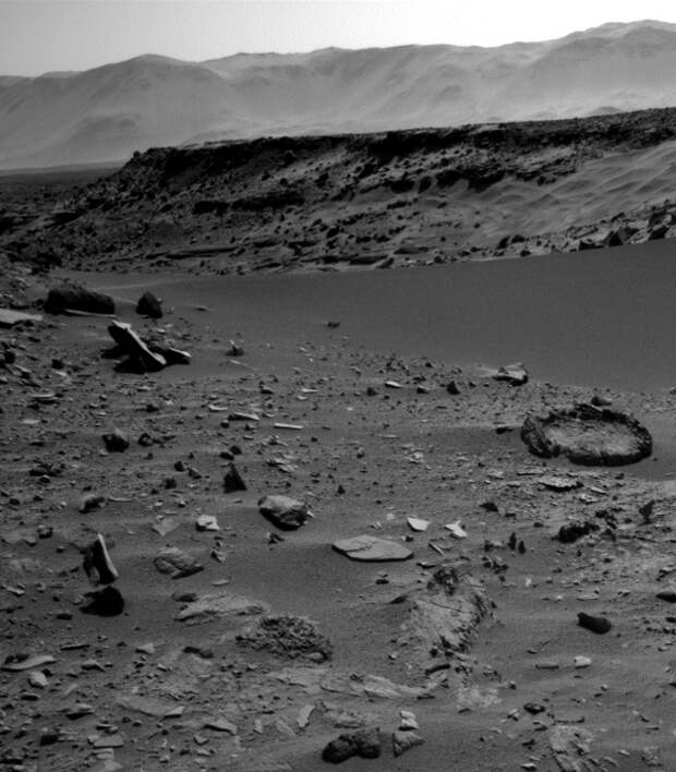 Снимок с левитирующим камнем был сделан 29 января 2014 года - на 527 день нахождения "Любопытства" на Марсе. Ровер фотографировал двумя навигационными камерами - левой и правой (Navcam: Left B и Navcam: Right B). Соответствующие снимки - один и другой - выложены на официальном сайте НАСА. И позволяют взглянуть на чудо-камень под разными углами. Но как ни смотри, а все равно кажется, что он парит.