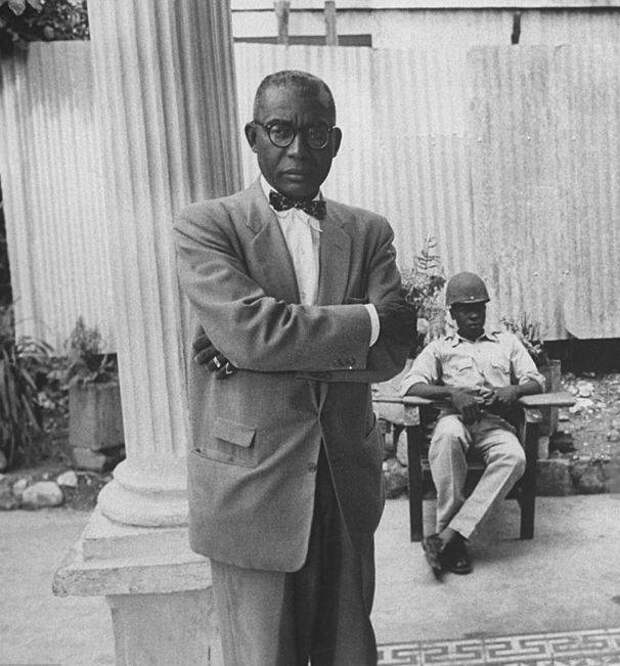 А это один из виновников нынешнего бедственного положения страны: «банановый» диктатор Франсуа Дювалье («папа Док»), который объявил себя жрецом вуду и «вождём мертвых»:
