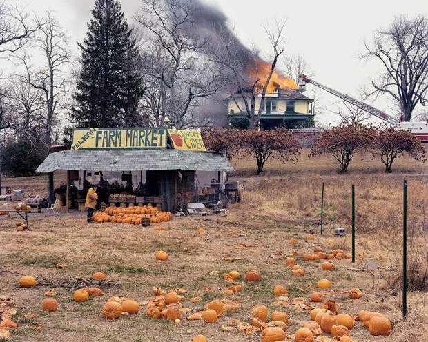 Пожарный покупает тыкву, пока ферма, пожар на которой, по-видимому, и привел его туда, горит на заднем плане.
