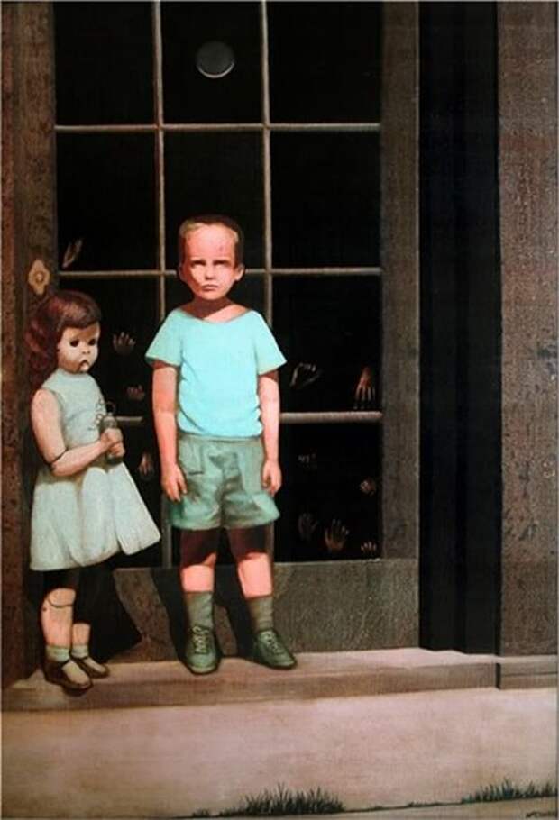 Самым неприятным элементом картины является недетское, страшное лицо мальчика. Впрочем, пустые глаза куклы тоже не радуют взгляд. |