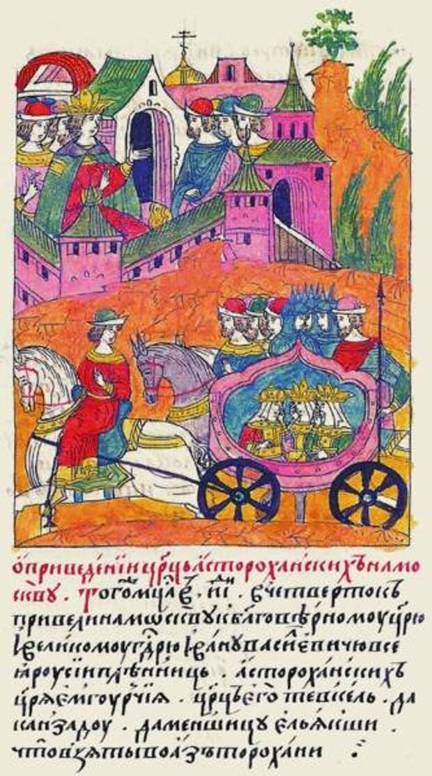Лицевой летописный свод: «В том же месяце в 18 день в четверг привели на Москву к благоверному царю и великому государю Ивану Васильевичу всея Руси пленниц астраханских, царя Емгурчея цариц его Тевкель да Клизаду, да младшую жену Ельякши, которые были взяты в Астрахани».