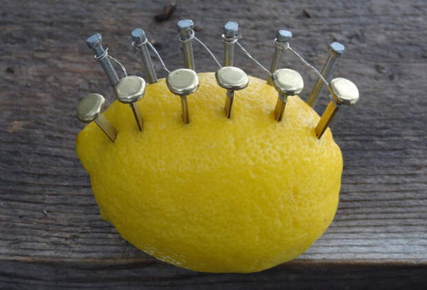 Помимо кислого цитруса Вам понадобятся медные и цинковые гвозди, а также кусочек провода. Правильно нашпиговав лимон гвоздями и обмотав их проводом, Вы получите уникальное устройство для розжига огня. Ловкость рук, и никакого мошенничества.