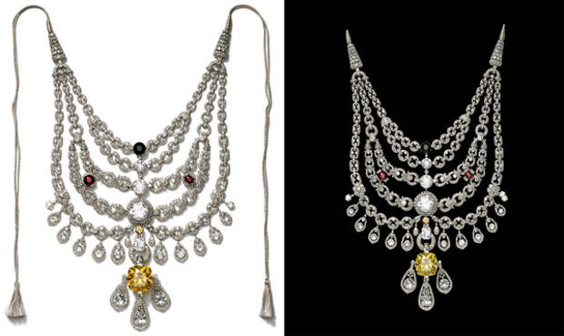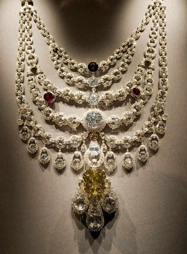 Результат их труда потрясал воображение — 2930 бриллиантов общим весом 962,25 карата и пара рубинов в платиновой оправе на платиновых цепях. По своей красоте получившееся ожерелье не имело равных в мире.