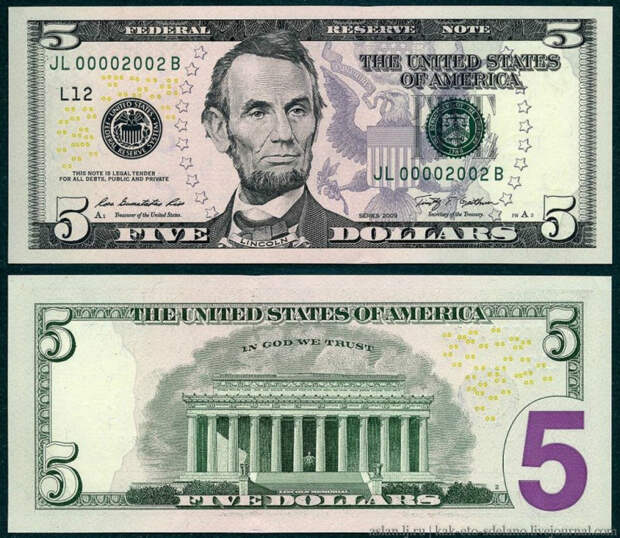 21. Пять долларов США — наименование банкноты США. В настоящее время на лицевой стороне банкноты присутствует портрет 16-го президента США Авраама Линкольна, а на обратной стороне — мемориал Линкольна.