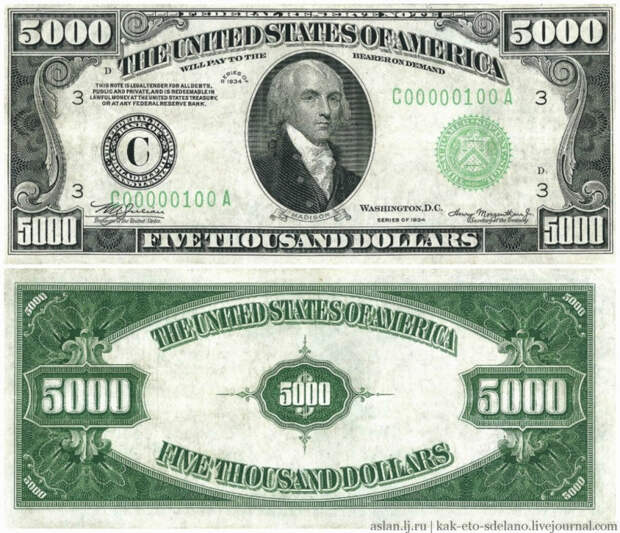 28. 4-й президент Джеймс Мэдисон (англ. James Madison) — на банкноте в 5000 долларов.