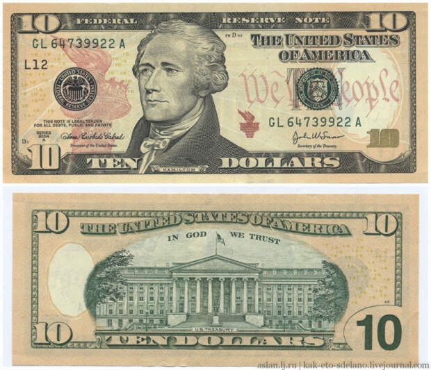 22. На лицевой стороне банкноты в 10 долларов изображен портрет первого министра финансов США — Александра Гамильтона, который не являлся президентом Америки, наряду с Бенджамином Франклином. На обратной же — здание Министерства финансов США. В настоящее время имеют хождение билеты серий 1996–2009 годов, износостойкость около 18 месяцев.
