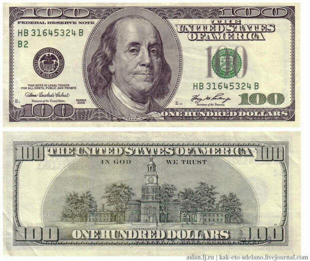 25. Сто долларов США — крупнейший по номиналу федеральный резервный билет США с 1969 года (хотя выпущенные ранее более крупные купюры номиналами 500, 1000, 5000 и 10 000 долларов действительны). В настоящее время в обращении находятся билеты серий 1996–2009. На лицевой стороне изображен Бенджамин Франклин, на обратной — Индепенденс-холл, где были подписаны Декларация независимости и Конституция США.