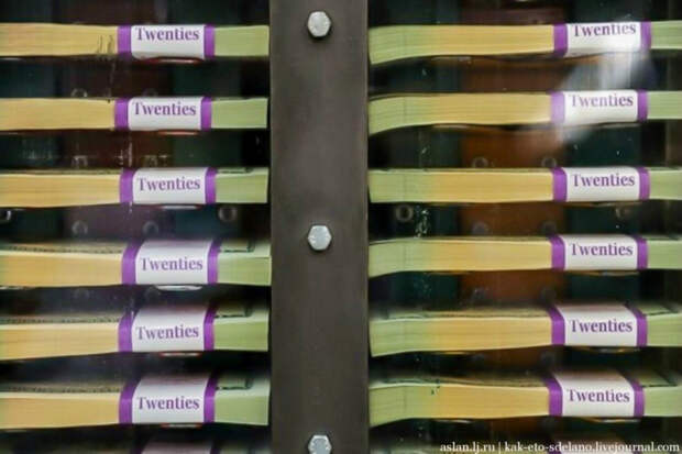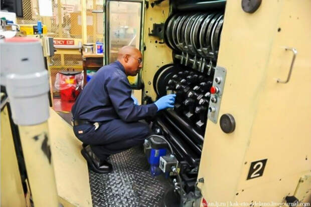 7. Затем рулоны с водяными знаками и нитями безопасности поступают в то самое Бюро США по гравировке и печати. Здесь очень серьезная охрана и крупнейшая система видеонаблюдения среди подобных организаций, направленная на контроль всех этапов производства долларов и на случай хищения. Когда рабочие попадают в здание, сложная система сканирования следит за каждым их шагом. В особо важных местах вмонтированы сигнализация и детекторы слежения. Здание бюро разделено на особые зоны, куда могут попасть только работники с определенным доступом.