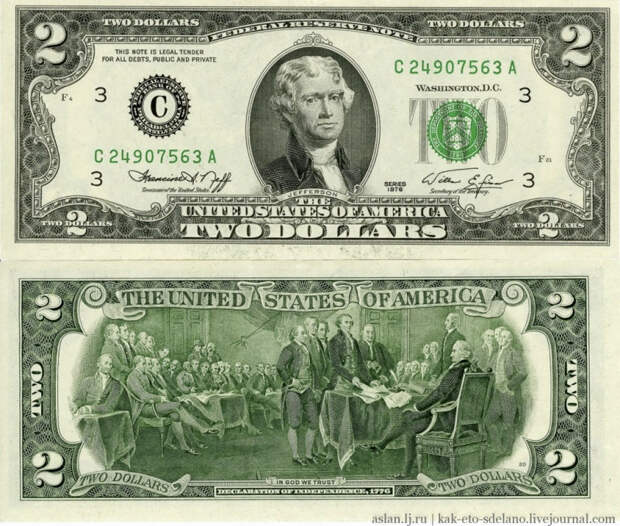 20. Два доллара США — второй по номиналу федеральный резервный билет США. На лицевой стороне изображен Томас Джефферсон, на обратной — репродукция картины Джона Трамбулла «Декларация независимости».