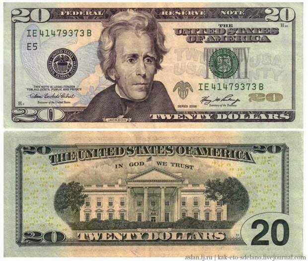 23. Двадцать долларов США. На аверсе банкноты изображен 7-й президент США Эндрю Джексон, на реверсе — фасад Белого дома со стороны 16-й авеню. В настоящее время имеют хождение билеты серий 1996–2009 годов.
