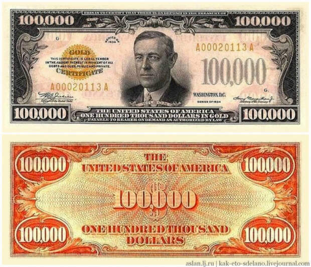 30. 28-й президент Вудро Вильсон (англ. Woodrow Wilson) — на банкноте в 100 000 долларов, выпущенной в 1934 году (банкнота создана для внутренних расчетов ФРС США, никогда не находилась в свободном обращении).