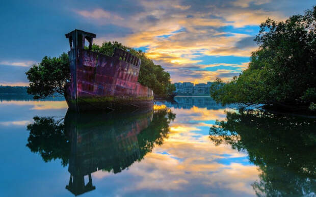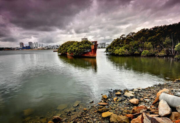 Это всеми забытое судно, находящееся в заливе Homebush Bay на южном берегу реки Парраматта, неподалёку от австралийского Сиднея. Во время Второй мировой войны SS Ayrfield, построенный для перевозки угля в 1911-м году в Великобритании и достигающий 80-ти м в длину, использовался американскими войсками как транспортировщик боеприпасов. Неизвестно, как это случилось, но корабль забросили, в результате сегодня он представляет собой что-то вроде большого искусственного острова.