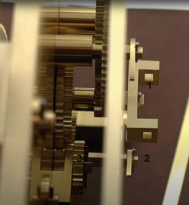 Фото конструкции. 1 – держатель указателя календаря, 2 – стрелка календаря олимпиад, крепление на конический штифт, 3 – одно из зубчатых колес, установка на квадрат, крепление коническим штифтом.