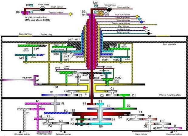 Схема привода частей механизма. Сверху планетарий, снизу календари. Цветом выделены части механической системы, отвечающие за движение отдельных планет