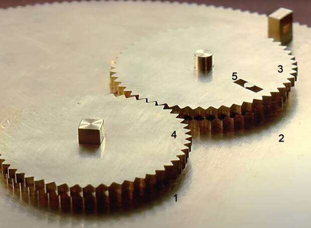 Фото рабочего образца узла попятного движения планет, где 1–4 – шестерни, 5 – pin и паз.
