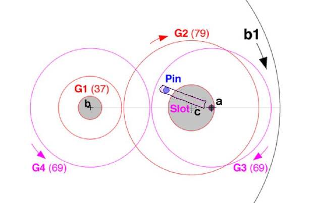 Чтобы учесть особенности видимого движения, использовалась система зубчатых колес, включавшая две несоосных шестерни G2, G3 с центрами «а» и «с», зацепление между которыми осуществлялось с помощью вертикального шплинта (pin) в нижнем зубчатом колесе G2 и радиального паза в верхнем колесе G3. В итоге при равномерном вращении нижнего колеса G1 верхнее G4 имеет разную угловую скорость.