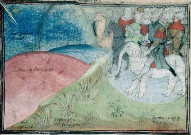 Просто замечательная миниатюра из манускрипта «Книга древних историй», 1285 г. Место создания: Франция. Британская библиотека, Лондон. Очень тщательно выписаны мельчайшие детали снаряжения и одежды, а также лица персонажей. Однако взгляните, кто составляет, так сказать, «экипаж» боевого слона? Это же явно мусульмане в тюрбанах, которые находятся в окружении западноевропейских рыцарей