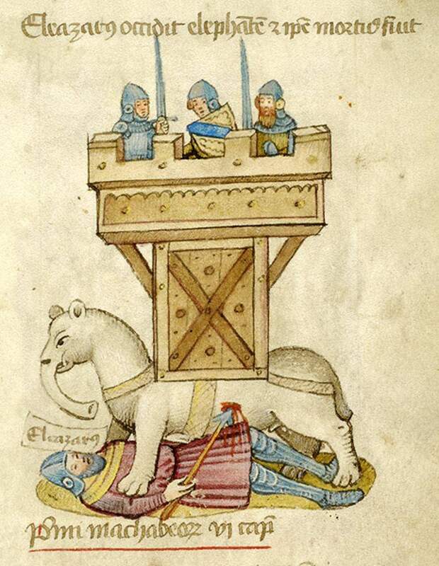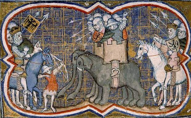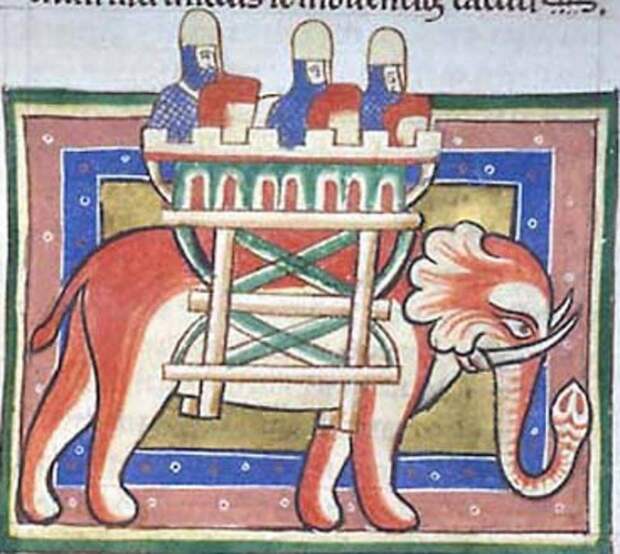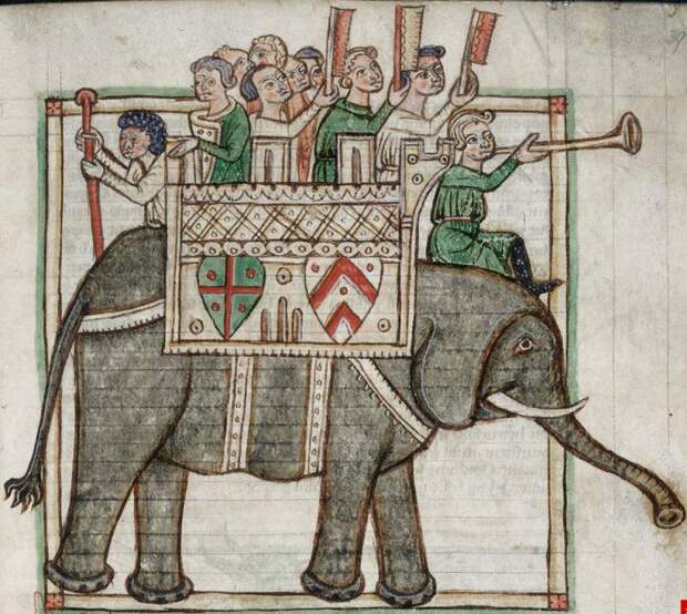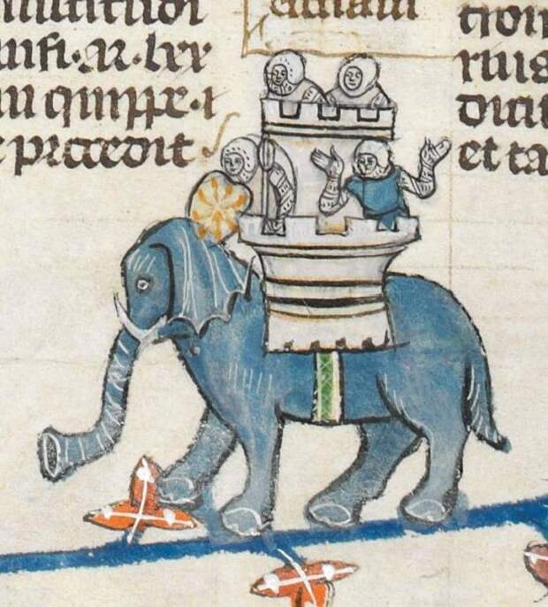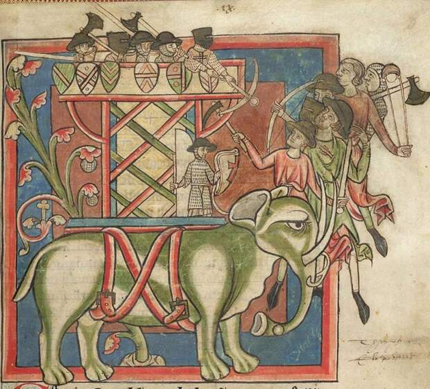 Одно из самых первых изображений боевого слона встречается в «Бестиарии» 1185 года, созданном в Англии. Библиотека и музей Пирпонта Моргана, Нью-Йорк. Очевидно, что художник вживую слона никогда не видел. Но в целом передал его внешний облик довольно точно. На головах у воинов очень характерные именно для этого времени шлемы