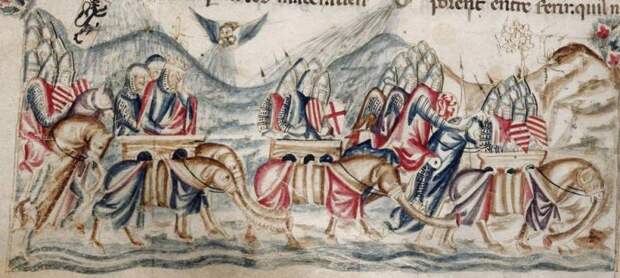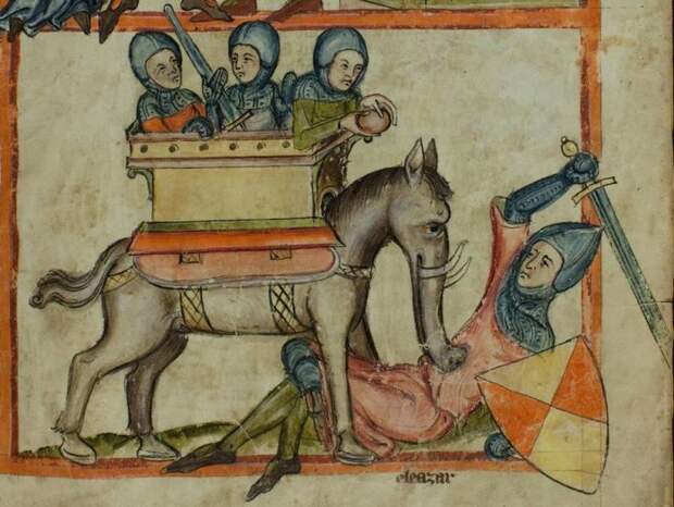Ещё одна миниатюра из «Бестиария», но уже 1225–1250 гг. Солсбери. Британская библиотека, Лондон. Здесь на слоне восседают и рыцари в шлемах топфхельм и шапель-де-фер с топорами, копьями и арбалетом в руках, а их в свою очередь обстреливают лучники и пращники