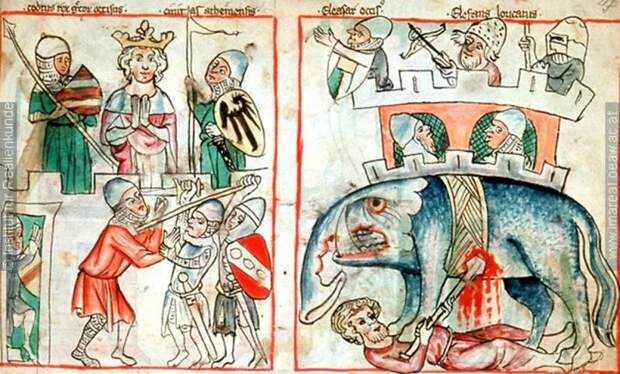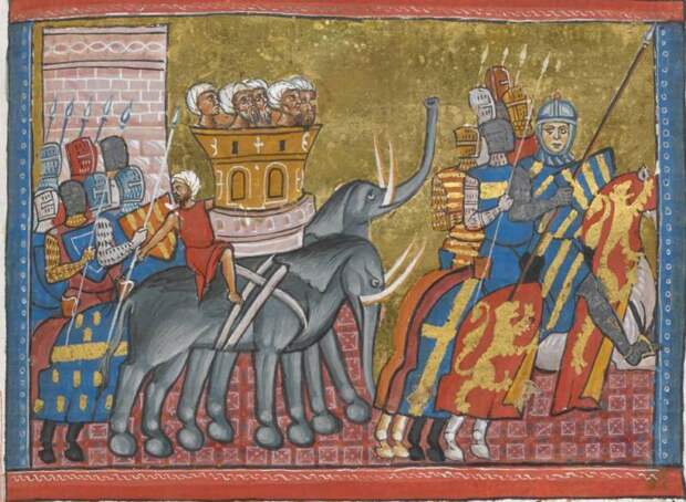 Отсюда именно в изображениях боевых слонов в миниатюрах средневековых художников иллюминаторов мы имеем поистине удивительный сплав знаний и фантазии, а ещё каждая миниатюра из датированной рукописи – это ещё и всякий раз памятник своему времени, потому что то, что этих художников в то время окружало, они изображали обычно очень точно. А вот историческим видением истории они не обладали, и потому экстраполировали своё видение современных реалий в далекое прошлое.