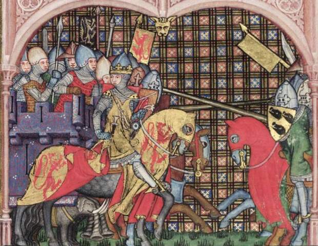 Прекрасная миниатюра из чрезвычайно популярного в Средние века «Романа об Александре» (конечно же, это Александр Македонский), около 1338–1344 гг. Бодлианская библиотека Оксфордского университета. Тут можно увидеть и доспехи, и сюрко, и конскую броню вместе с попоной, разные виды шлемов и даже кинжал рондель. Более того, очень показательно, что под сюрко у Александра явно просматривается броня из клепаных полос, то есть эта миниатюра очень достоверно представляет нам рыцаря в доспехах «переходного периода» – от «эпохи кольчуги» к «эпохе белых доспехов». Ну, а где же на ней слон? Слон, вернее – слоны, с огромными башнями на спине изображены под брюхом коня Александра. Ведь Александр же важнее!
