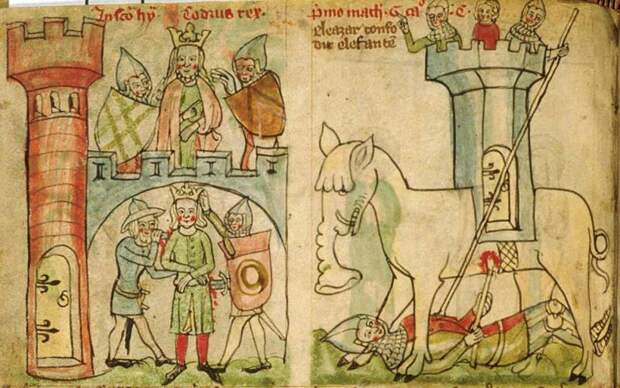 Средневековье не было таким уже темным временем, как это некоторые себе представляют. При желании в то время можно было познакомиться и вот с таким манускриптом, как «Древняя история до Цезаря», 1325–1350 гг., который был написан в Неаполе в Италии, а сейчас находится в Британской библиотеке в Лондоне. Тут для художника было явно все очень просто. Вполне современные ему рыцари на его миниатюре едут на слонах, словно на ослах, причем слоны нарисованы с копытами! Интересно, что на головах у многих из воинов надеты шлемы с крестообразным усилением лицевой части и вдобавок с вытянутой вверх тульей, получившие очень меткое прозвище – «сахарная голова»