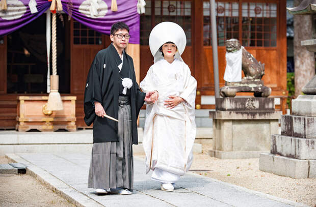 Японским невестам приходится ломать голову не над одним, а как минимум над тремя нарядами. Более того, с каждой сменой кимоно меняется и прическа, и макияж. Традиция берет свое начало в XIV веке и означает готовность к разнообразной повседневной жизни.