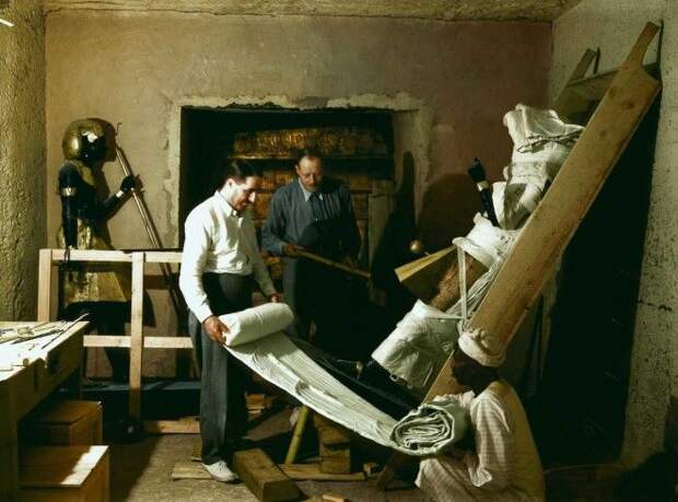 18. 30 декабря 1923 года. Картер, Мейс и египетский рабочий бережно сворачивают льняной покров.