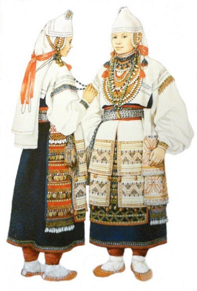 Костюм водской невесты/ © wiki-karelia.ru Традиции этого народа интересны и уникальны. Они проявляются во многом — начиная от одежды, и заканчивая привычками и чертами характера. К примеру, водский женский костюм имеет четыре разновидности, соответствующие четырем этапам жизни женщины. Девичий наряд сдержанный, в нем преобладают только красные и белые цвета, а украшений и вышивки минимум. Самый нарядный — костюм молодки. Белая рубаха, голубой сарафан и красно-синий передник с большим обилием вышивки, жемчуга и полудрагоценных камней. После рождения ребенка из наряда пропадали украшения и цвета становились менее яркими и пестрыми. А в возрасте "за тридцать" вожанки надевали одежду старух — белую длинную рубаху и полотенчатый головной убор.