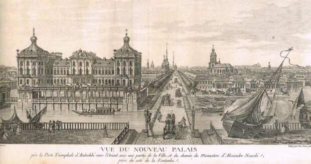Николя Луи де Леспинас. Вид нового дворца со стороны Аничкова моста вблизи с Триумфальной аркой, вид на город, путь к Александро-Невской лавре со стороны Фонтанки, 1783 г.