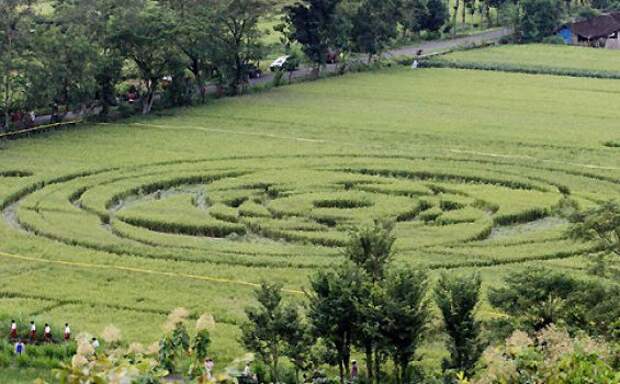 Круги зафиксированы в Индонезии впервые и представляют собой большой круг диаметром около 30 метров и заключенные в него два меньших по диаметру и треугольник, сообщается на сайте журнала Tempo. Эти правильные фигуры на поле созревшего риса высотой 60-70 сантиметров, которые хорошо видны с вершины соседнего холма, образованы широкими полосами склонившихся на полуметровой высоте стеблей.