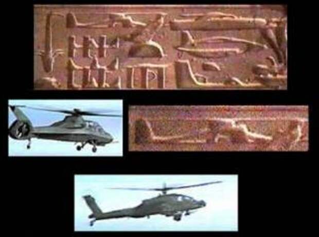 Через 150 лет, в конце XX века, солидная арабская газета "Аш Шарк аль-Аусат" опубликовала несколько фотографий, сделанных в храме бога солнца Амона-Ра в Карнаке. Древний художник изобразил на камне одного из древних храмов, построенного во времена фараона Сети Первого, правившего три тысячи лет назад, боевой вертолет с явно различимыми лопастями несущего винта и хвостового оперения, а рядом старательно высек другие летательные аппараты, похожие на современные истребители и бомбардировщики. Их сравнили с иероглифами из храма Сети в Абидосе. И стало понятно, почему египтологи XIX века не могли догадаться, что изображено на стенах храма. Они просто не знали, как выглядят вертолеты. Для проверки этого предположения в Абидос отправился один из самых известных египтологов Алан Элфорд. Он тщательно изучил таинственные иероглифы и, вернувшись, заявил в интервью журналистам, что древние египтяне изобразили боевой вертолет с удивительной достоверностью.
