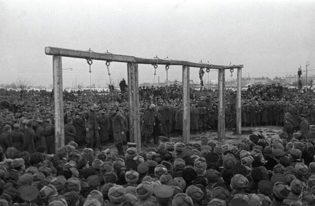 Казнь немецких военных, осужденных по Рижскому процессу, на площади Победы в Риге. 1946 год. Рижский судебный процесс – один из послевоенных советских открытых судов в отношении военнослужащих Третьего рейха и его союзников, обвиняемых в совершении военных преступлений в период Второй мировой войны. Проходил в Риге в 1946 г. Перед судом предстали восемь высокопоставленных военнослужащих: шесть генералов вермахта, один обергруппенфюрер СС и один штандартенфюрер СА. Всех их судили за преступления, совершенные в 1941–1944 годах на территории, окупированной немцами Прибалтики. Подсудимых обвиняли в организации массовых убийств, уничтожении городов, угоне населения Прибалтики в Германию. Семь подсудимых были приговорены к смертной казни и публично повешены на площади Победы в Риге