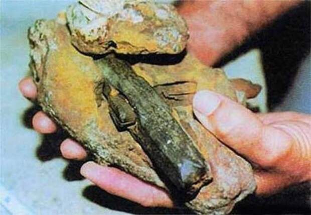 На вид вполне обычный, хотя и довольно большой - длиной пятнадцать сантиметров, с деревянной ручкой. Но вот что странно: молоток буквально врос в кусок известняка. В общем, парочка отколола камень и решила показать находку ученым.